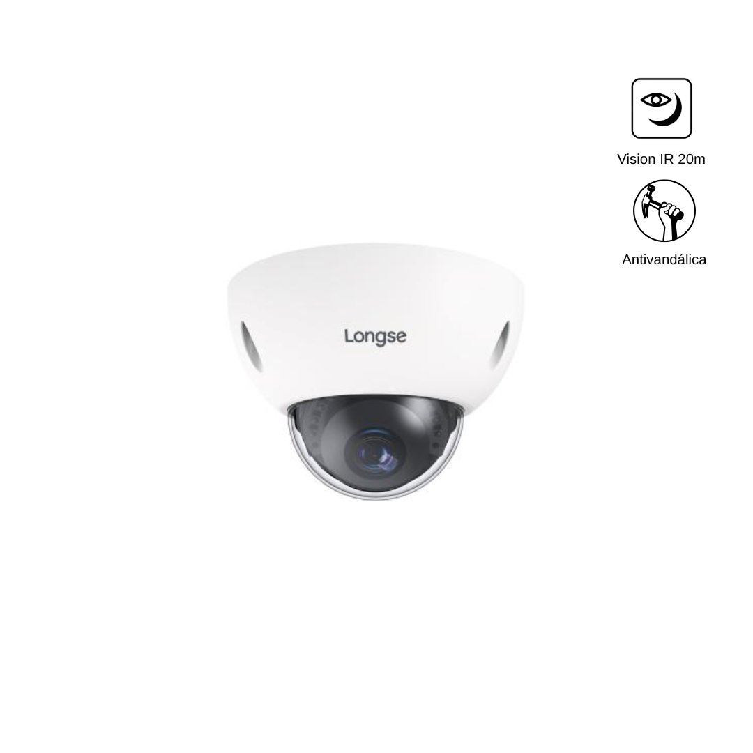 Cámara domo antivandálica de 2MP con sensor Sony, lente fijo de 2.8 mm y visión nocturna IR de hasta 20 metros. Diseñada para exteriores, cuenta con protección IP66, soporte OSD & UTC y carcasa resistente a impactos.