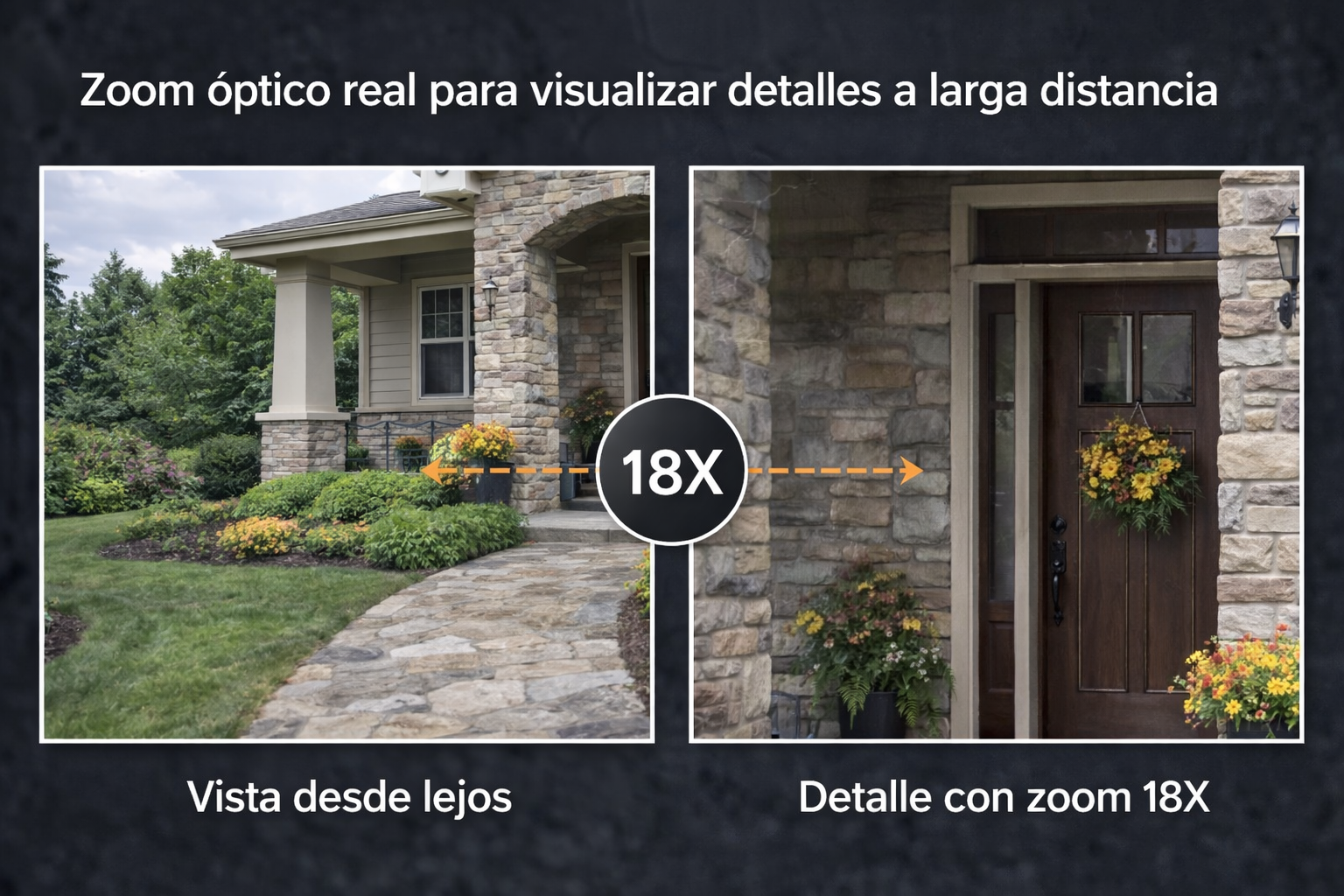Gracias a su zoom óptico PTZ de 18X, esta cámara permite monitorear grandes áreas y capturar detalles a larga distancia sin pérdida de definición. Su sensor CMOS OV de 5 megapíxeles entrega imágenes claras tanto de día como de noche, incluso en condiciones de baja iluminación.