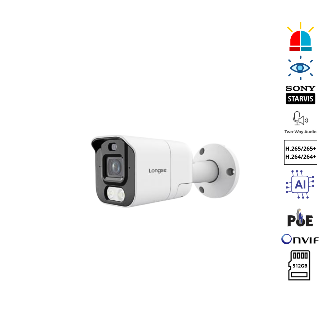 La Cámara de Red Tipo Bala de Disuasión Activa BMSEKL5AD de 5MP está diseñada para ofrecer vigilancia profesional en exteriores, combinando tecnología de imagen SONY Starvis, funciones avanzadas de inteligencia artificial y un sistema de alerta visual altamente efectivo. Ideal para hogares, negocios, bodegas, industrias y cualquier entorno que requiera máxima seguridad y evidencia clara.